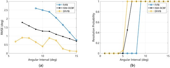 The performances of FrFB, ISM-DCBF, and DFrFB versus different angular intervals. (a) The RMSE; (b) the resolution probability.