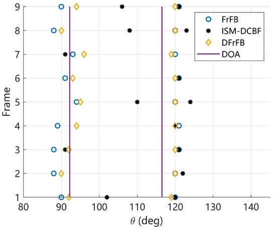 The DOA estimations of nine consecutive frames are given in Figure 8, where the vertical lines represent the real DOAs. The average RMSE, beamwidth, and sidelobe level are listed in Table 3. DFrFB effectively optimizes the spatial spectrum of FrFB under experimental conditions. Compared with FrFB, DFrFB reduces the beamwidth by 77% and the sidelobe by 6.0 dB, resulting in more accurate DOA estimations. Compared with ISM-DCBF, DFrFB yields more stable and accurate DOA estimations, as well as a cleaner spatial spectrum. It is demonstrated that the proposed DFrFB possesses the best performance among the three methods.