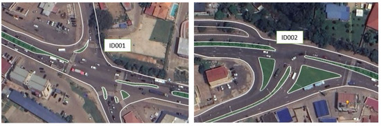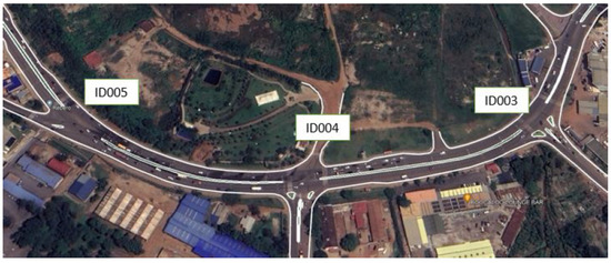 The junctions were chosen based on the fact that they are the busiest intersections in the CoK. One of the common characteristics of these junctions is that they are adjacent. The intersections were given identification numbers (ID), ID 001 (Lat. 1°57′39.13″ S, Long. 30°07′12.91″ E), ID 002 (Lat. 1°57′34.18″ S, Long. 30°7′0.88″ E), ID 003 (Lat. 1°58′7.73″ S, Long. 30°5′17.93″ E), ID 004 (Lat. 1°58′9.99″ S, Long. 30°5′9.62″ E) and ID 005 (Lat. 1°58′7.77″ S, Long. 30°5′1.52″ E), respectively. The entire average delay time at these junctions would be reduced only when coordinated control of traffic signals is applied and that has to depend on the traffic situation captured by the RSU imposed on the junctions. As the traffic flow rate depends on the period of the day and the season, respecting real-time traffic flow-based traffic signal scheduling could increase the effectiveness of the battery state of charge [34]. Figure 1 and Figure 2 show the aerial layouts of our areas of study.