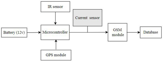 The RSU experiment setup was composed of the microcontroller, SIM 800L, GSM/GPRS module, GPS module, current sensor, IR sensor and the 12 V battery supplying the RSU node. Figure 3 shows the internal part of the RSU. This is the main part of our experiment as it is the one that senses data and sends them to the remote database for further analysis: