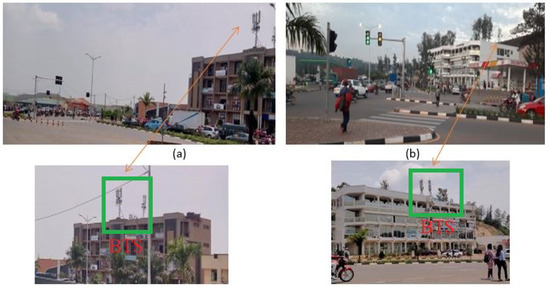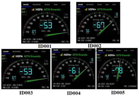 Figure 6 shows the readings by the network cell info Android application that was used to identify the BTS location. The application was used to determine network signal strength and local serving cell information. The network operator and operator ID information at each location were collected and shared with the network operator to help us in identifying the geolocation of the BTSs. This information was used later on to measure the distance from RSU to BTS. The distances from ID001 to BTS were 50 m, ID002 to BTS (30 m), ID003 to BTS (30 m), ID004 to BTS (40 m) and ID005 to BTS (50 m), respectively. Figure 7 shows where the BTS were located on some of the junctions in the study.