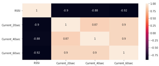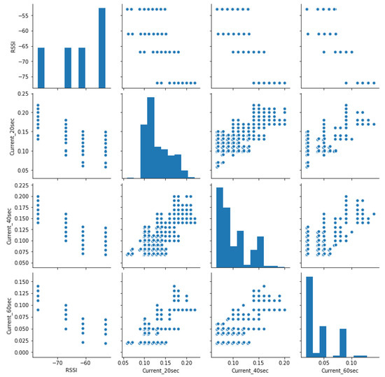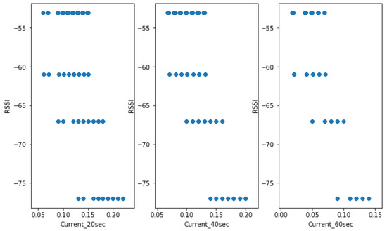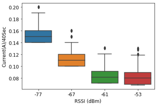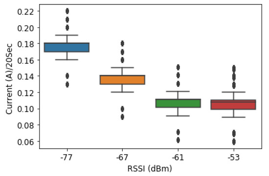 The RSU current consumption (C) increased or decreased based on the increase or decrease of the processing unit’s current consumption (C) and the current consumed by the radio unit (C). The C varies based on the change in data transmission frequency. The C depended on the RSSI value of the location where the RSUs were located. The current consumed by the sensing unit (C) remained constant as the RSU components were the same at different locations. In our experiment, the current data were captured and then transmitted to the database every 20 s, 40 s and 60 s, respectively, where, later on, the data were extracted in CSV format and analysed in Python to evaluate the best ML model for the prediction.