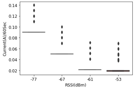 GPRS code for transmitting data to a remote database every 60 s was written. According to Figure 14, the average amount of current consumed by SIM800L was significantly reduced. At the location where the RSSI was −77 dBm, the current consumption when the RSUs transmit the data every 60 s was 0.04 A on average compared to −67 dBm (0.04 A), −61 dBm (0.03 A) and −53 dBm (0.01 A and 0.01 A), respectively. This leads to the fact that, when the transmission frequency is reduced, the current consumption reduces at both locations where the RSSI is good and where it is not adequate.