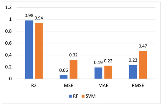 To validate the prediction capability of the suggested models, the accuracy of the RF versus SVM model was assessed to evaluate their performance. RSSI values, current consumption and data transmission frequency were the inputs to the models. is the measure of how the values fit together in relation to the starting values; this is an indication of goodness of how well unseen samples are likely to be predicted by the model. The MAE represents the original-to-predicted value difference, and this is the average absolute difference across our whole data set. The RMSE stands for residual mean square error or prediction error. Compared to the SVM model, RF revealed a higher and lower MSE, MAE and RMSE. Figure 15 shows the prediction results from the comparison of the RF and SVM model.