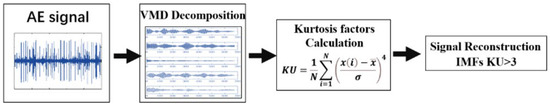 Flowchart of the VMD-kurtosis denoising method. First, VMD decomposition is applied to the acoustic emission (AE) signal to convert the signal into eight IMFs. Next, the kurtosis factor value of each IMF is calculated. Finally, the IMF with kurtosis factor > 3 is reconstructed.