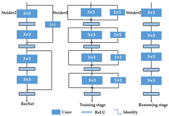 RepVGG network architecture. Left image: residual structure in ResNet. Middle image: training phase, using a similar multibranch residual structure inspired by ResNet. Right image: inference stage, converting all the network layers to Conv 3 × 3 through the reparameterization process. The rectified linear unit is a piecewise linear activation function that outputs the input directly if it is positive and zero otherwise [22].