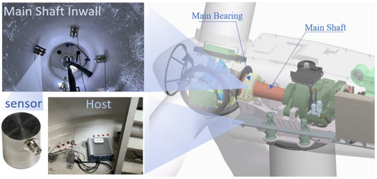 The experimental process is illustrated in Figure 6. The AE signals of the main bearing of a variable-speed constant-frequency doubly fed wind turbine unit were monitored. The main components of the transmission system were the main shaft, bearing, gearbox, coupling, generator, and main frame. To avoid the interference of the gearbox noise signal, the sensors were placed on the front bearing (near the hub side). Four DP15I AE sensors with a frequency of 60–400 kHz were used on each wind turbine, arranged on the inner wall of the main bearing counterclockwise. The diameter of the inner wall of the main bearing was approximately 50 cm, and the arc distance between each sensor was approximately 39 cm.