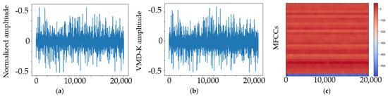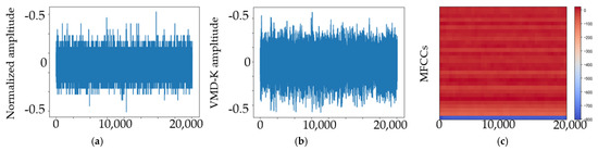 AE signals of the normal health state at 20 rpm and 100 kN radial load: (a) original signal; (b) signal after denoising; (c) MFCCs.