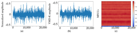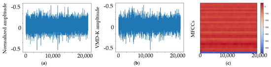 AE signals of the MRE damage state at 20 rpm and 100 kN radial load: (a) original signal; (b) signal after denoising; (c) MFCCs.