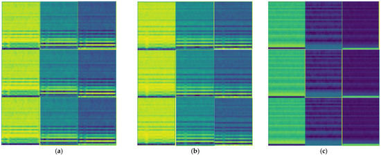 We studied the ability of EMA-RepVGG, especially RepVGG A0, to perform bearing fault diagnosis. To validate the performance of this method, AE signals from the bearing fault simulator and wind turbine spindle bearing on-line experiment were acquired using the testbed. As discussed in Section 2.4, the MEA-RepVGG convolutional architecture can achieve feature extraction and fault diagnosis of extreme-low-speed heavy load bearings. Signal processing examples of normalized AE signals for the normal, RE, OR, and MRE damage states are shown in Figure 7, Figure 8, Figure 9 and Figure 10, where (a) is the original signal, (b) is the signal after denoising, and (c) are MFCCs, respectively. The corresponding feature map output from the EMA-RepVGG feature extractor is shown in Figure 10a–c. The information contained in the multifaceted MFCC spectrograms was translated and synthesized in a low-dimensional feature space through feature embedding. The classifier discerns classes by learning the differences between feature embeddings.