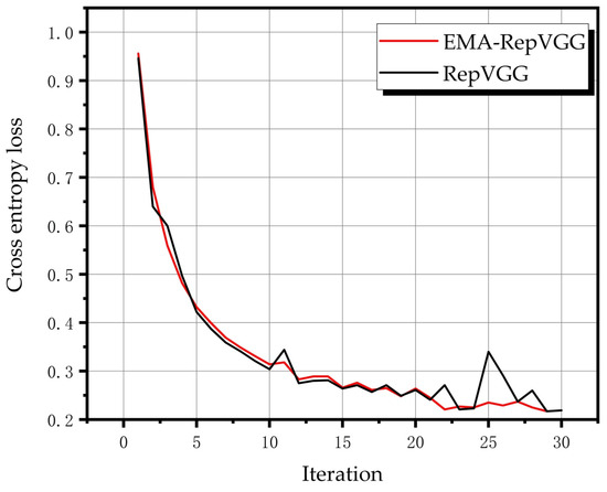 Furthermore, the proposed model was compared with ResNet-50 [38], EfficientNet V1 [39], EMA-RepVGG with FFT, and EMA-RepVGG without VMD-kurtosis denoising. The accuracies obtained using different models are presented in Table 7, and the precision and recall for different classes are listed in Table 8. Although ResNet and RepVGG use a similar residual technique, the use of the structural reparameterization technique greatly increased the reasoning speed of RepVGG. The EfficientNet V1 model exhibited satisfactory accuracies and reduced training times; however, some amount of overfitting was observed. EMA-RepVGG with FFT yielded lower accuracies than the proposed model because MFCCs can better reflect the low-frequency part of the signal; thus, RepVGG with MFCCs is more suitable for low-speed industrial equipment. EMA-RepVGG without VMD-kurtosis denoising yielded a lower accuracy than the proposed model under the same training cycle; although its overall training duration and reasoning duration were less than that of the proposed model, subsequent experiments revealed that it took more time to reach the same accuracy by improving the number of training cycles alone without preprocessing and denoising, which also demonstrates that for a certain understanding of signal fault information, proper pretreatment can optimize the fault diagnosis process.