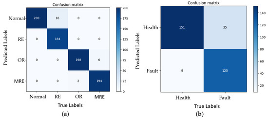 Test confusion matrix: (a) bearing fault simulator; (b) wind turbine spindle bearing.