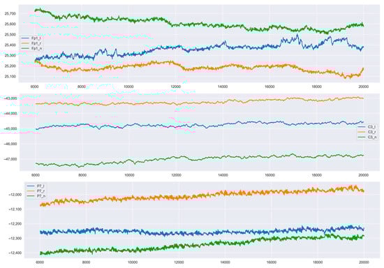 Figure 5 and Figure 6 show the three channels for six sensors of one of the subjects. Fp1, Fp2—frontal lobe left and right. C4—near the parietal lobe. P7, P8—occipital lobe closer to the midline. 02—occipital part.
