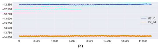 Signals from sensor P7 for two participants. (a) Signal changes over time. (b) Distribution of values for each of the signals. It is clearly seen that for the P7_IM signal, all values were grouped in the −14,000 microvolt region, while for the P7_ID signal, these values were in the −12,250 microvolt region.