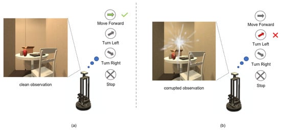To evaluate the robustness of embodied navigation agents in various visual corruptions, ROBUSTNAV [13] provides a variety of realistic visual corruptions for emulating corruptions in the real world, and the robustness of the agent is evaluated after learning navigation policies with those visual corruptions. Ref. [13] points out that the performance of standard navigation agents, which work effectively with clean observation, drops dramatically in the presence of visual corruption. As shown in Figure 1a, the navigation agent’s observation is clean, and it is straightforward to choose the optimal action. However, it is more difficult for the agent to choose the optimal action in the presence of visual corruption, as shown in Figure 1b. It is worth noting that the agent has to choose an action at each time step in navigation. The weak robustness to visual corruption causes the agent to struggle to reach the target.