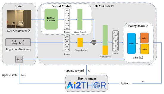 The overall architecture of the proposed RDMAE-Nav is shown in Figure 2. The framework follows the DRL pipeline, with the state space formed by the agent’s egocentric RGB observation, the target localization, and the previous hidden states. AI2THOR [2] is chosen as the simulation platform, which updates the state and outputs a reward for the next training step of DRL.