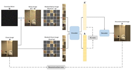 A self-supervised learning scheme is utilized to extract latent features for discriminative visual representations, with an auxiliary task constructed under the condition of insufficient labels. The autoencoder of the encoding–decoding mechanism is employed in the self-supervised learning scheme by following [15], with some modifications. Specifically, the encoder maps the input of both noisy and clean images into the low-dimensional feature space, and the decoder reconstructs the potential features of the noisy images back to the original clean images. Since both noisy and clean images are masked to be involved in the encode–decode process, a bidirectional Kullback–Leibler (KL) divergence loss is constructed to mitigate the representation distribution gap between them,