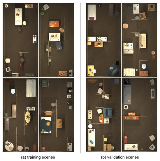 The experiments are conducted on the simulation platform AI2THOR [2] with the dataset RoboTHOR [39]. RoboTHOR contains 75 indoor scenes of 8.8 m × 3.9 m, of which 60 scenes are used for training (Figure 5a) and 15 scenes are used for validation (Figure 5b). There is a total of 108,000 different navigation tasks in the training scenes and 1100 different navigation tasks in the validation scenes. Some selected samples of scenes are shown in Figure 5. The validation scenes are set differently from the training scenes to evaluate the agent’s generalization to the novel scenes. The LoCoBot [40] robot is used as the navigation agent, which is equipped with an Intel RealSense camera.