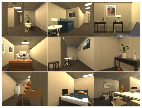 - Kolve, E.; Mottaghi, R.; Han, W.; VanderBilt, E.; Weihs, L.; Herrasti, A.; Gordon, D.; Zhu, Y.; Gupta, A.; Farhadi, A. Ai2-thor: An interactive 3d environment for visual ai. arXiv 2017, arXiv:1712.05474. [Google Scholar]