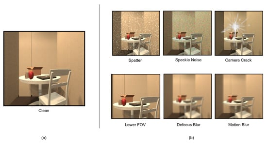 Most of the current work focuses on improving the generalization of the agent to novel environments, and the agent’s visual observations are clean during training and validation. However, there are various visual corruptions in real environments. Although [10,22,23] considered the visual sensors and actuation noise that may exist in navigation, these noise types are too simple to cover the rich visual corruptions that exist in real environments. In order to be able to quantitatively evaluate the robustness of embodied navigation agents to visual corruptions that may exist in the real environment, [13] proposed an evaluation framework called ROBUSTNAV. ROBUSTNAV contains a variety of visual corruptions, including Spatter, Speckle Noise, Camera Crack, Lower FOV, Defocus Blur, Motion Blur, etc. These visual corruptions can simulate real-world perturbation scenarios well. Ref. [13] pointed out that the performance of some near-perfect methods is severely degraded when evaluated in the presence of visual corruption.