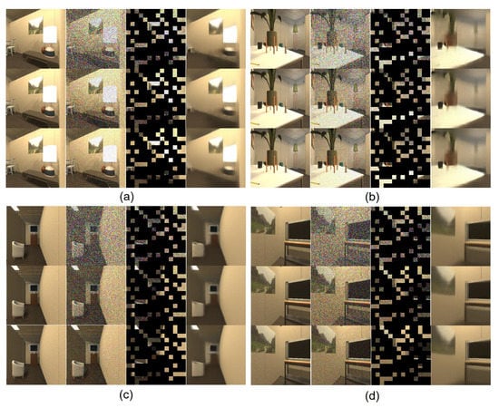 After training, the RDMAE visualization of the reconstructed images is shown in Figure 8a–d from four different scenes in the RoboTHOR validation set. For each image from left to right are the original image, the Gaussian noise image (from top to bottom noise level = 0.5, 0.25, 0.1), the masked Gaussian noise image, and the reconstructed image. It is worth noting that the reconstructed images we show here are from the RoboTHOR validation set, which has not been seen by the agent during RDMAE training. Compared with the original clean image, RDMAE is able to reconstruct the masked noisy image well, indicating that RDMAE is able to extract robust features.