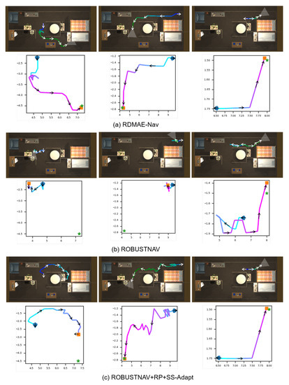 Additionally, examples of the evaluated navigation trajectory visualization of RDMAE-Nav, ROBUSTNAV, and ROBUSTNAV+RP+SS-Adapt under Spatter are shown in Figure 9. The blue cardinal represents the agent’s initial position and orientation, the orange square represents the agent’s stop position, and the pentagram represents the target. Compared with ROBUSTNAV, RDMAE-Nav shows superior navigation performance in the presence of Spatter. Compared with ROBUSTNAV+RP+SS-Adapt, even though it reaches the target (middle part of Figure 9c), its actual path is longer compared with RDMAE-Nav (middle part of Figure 9a).