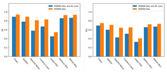It is known from Figure 10 that introducing the KL Loss into the pretraining for the visual encoder improves the performance of RDMAE-Nav both in clean and various visual corruptions. In detail, for Speckle Noise, the performance improvement is the most significant by introducing KL Loss to RDMAE-Nav, with absolute improvements of 23.48% in SR and 21.63% in SPL, as in Table 3. For other corruptions, there are also varying degrees of performance improvement. From Table 4, RDMAE-Nav obtains higher R and lower Dist compared with RDMAE-Nav without KL Loss, which indicates that the introduction of KL Loss makes the navigation agent have more reliable and robust decisions in the presence of visual corruption.