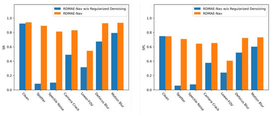Note that the visual encoder of RDMAE-Nav is pretrained by a Regularized Denoising reconstruction task. In this study, we specifically analyzed the contributions of Regularized Denoising. This ablation removes Regularized Denoising during pretraining of the visual encoder. To conform with the configuration, we do not add Gaussian noise to the clean image and reconstruct the masked clean image accordingly by the encoder–decoder. The results are shown in Figure 11 and Table 5.