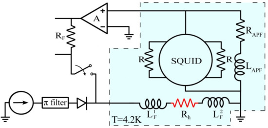 The characterization of the SQUID magnetometer, including the measurements of both voltage as a function of magnetic flux and magnetic flux and field noise in normal and under local heating conditions, has been performed in a helium bath (T = 4.2 K) by using a cryogenic insert equipped with two coaxial cylinders to operate in a high-shielded environment. The inner one is made of superconducting metal (lead), while the outer one consists of a high magnetic permeability material (μ-metal). The measurements have been carried out using a very low noise readout electronics, where the SQUID is direct coupled to a preamplifier and connected to a negative feedback circuit operating in flux locked loop mode to increase the linear dynamic range (Figure 2). The whole amplification stage is integrated on a small standard electronics board located at the top of the cryogenic insert carefully shielded by a copper box and kept at room temperature. All the electrical connections to the SQUID were radio frequency filtered. The current is sent into the integrated heater resistor by a battery powered dc-current generator; a suitable stage of filters is employed to reduce the conducted and/or radiated disturbances through the connecting wires (Figure 2).