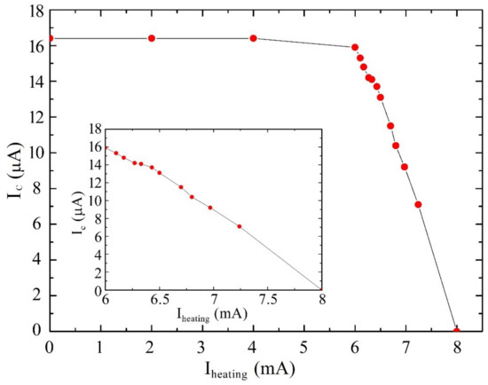 Critical current of the SQUID magnetometer as a function of the current sent into the integrated heater (red dots). After a value of 6 mA, the critical current decreases in appreciable way. The same curve is shown in the inset where the Iheating starts from 6 mA to better highlight the behavior of the curve and evaluate the rate of decrease in the critical current. The solid lines are eye-guidelines.