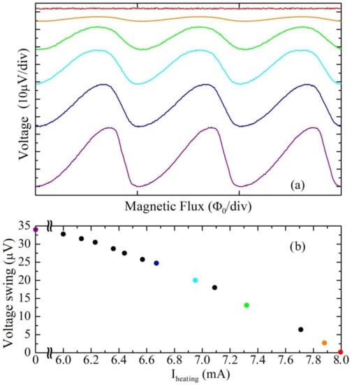 (a) Voltage–magnetic flux characteristic (V-Φ) of a SQUID magnetometer for different heating current measured at liquid helium temperature. (b) Amplitude of the voltage swing for different heating currents. The color of each V-Φ curve reported in (a) corresponds to the circle with the same color in (b).