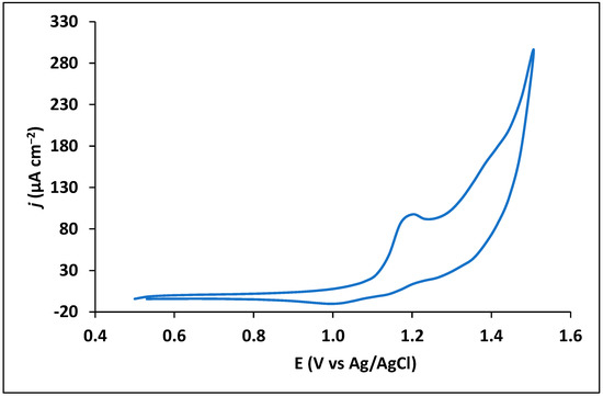 Trimethoprim is an antibiotic drug that contains amino and oxygen functionalities in its chemical structure, being this way susceptible to electrochemical reaction processes. Preliminary experimental studies were performed in order to understand the electrochemical behaviour of trimethoprim drug using an unmodified CPS. A simple CV measurement showed a peak at around +1.2 V, indicating oxidation of the drug (Figure 2) with irreversible nature, in accordance with other studies [25,35,39].