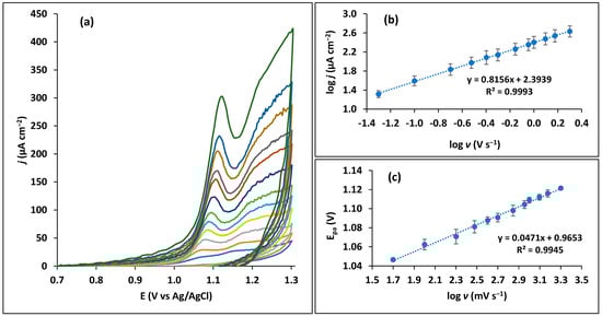 Plotting the peak potential at the different scan rates versus the logarithm of the scan rate, linearity is observed (Figure 3c), the slope being equal to 2.303RT/(1 − α)zF. Taking in consideration a transfer coefficient (α) of about 0.5 for this molecule [22,42], the calculated number of electrons, z, corresponded to 2.
