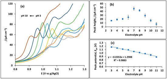 Optimization of electrolyte (0.1 M Britton–Robinson buffer) pH for 10 µM trimethoprim. (a) SWV curves from pH 3 to pH 12. (b) Influence of pH in trimethoprim peak height. (c) Influence of pH on trimethoprim peak potential.