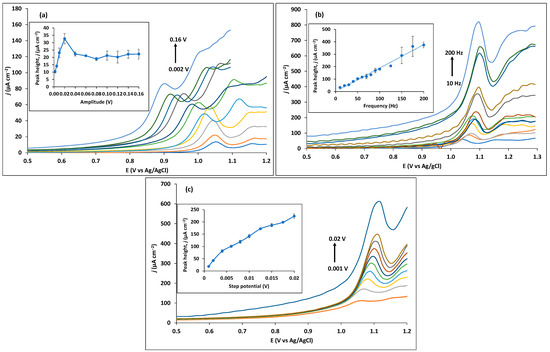The SWV technique parameters may also significantly influence the analytical signal. This way, amplitude, step potential, and frequency were each individually optimized, while keeping the other parameters constant. When varying the amplitude from 0.002 to 0.16 V, it is possible to observe in Figure 6a that peak height raises sharply until 0.02 V, which then decreases and stabilizes. Therefore, an amplitude value of 0.02 V was selected as optimum and used in the following optimizations. Next, frequency was varied from 10 to 200 Hz (Figure 6b). Although peak height increases almost linearly, an unreproducible behaviour is noted for high values of frequency. The step potential varies from 0.001 to 0.02 V, which translates to a scan rate range between 100 and 2000 mV s−1 (Figure 6c). The peak height of trimethoprim constantly increases; however, here too, an unreproducible peak shape and significant noise with increasing scan rate is observed. To achieve a compromise between reproducibility and good signal, a frequency of 50 Hz and step potential of 0.015 V are chosen, which corresponds to a scan rate of 750 mV s−1.