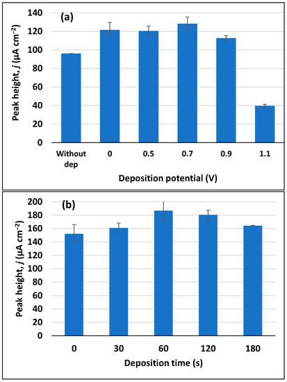 Optimization of deposition conditions for 10 µM trimethoprim in 0.1 M Britton–Robinson buffer pH 7. (a) Influence of deposition potentials on trimethoprim peak height (deposition time of 60 s). (b) Influence of deposition time on trimethoprim peak height.