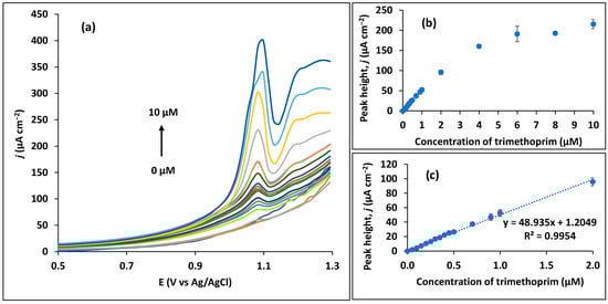 Assays for determination of the linearity range of trimethoprim in the optimum conditions (pH 7; SWV parameters: 0.02 V amplitude, 50 Hz frequency, and 0.015 V step potential; deposition of +0.7 V and deposition time of 60 s). (a) SWV curves up to 10 µM. (b) Peak height for all concentrations range tested (up to 10 µM). (c) Linear calibration range.