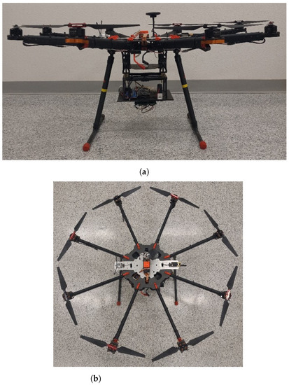 (a) Front view and (b) top view of octocopter UAV platform equipped with air quality sensor package and VOC air sampler.