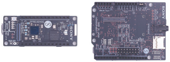 The main board (left) and extension board (right) of the Sony Spresense microcontroller used for the air quality sensor package and VOC air sampler.