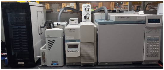 After the data collection experiments, the sorbent tubes were analyzed via thermal desorption-gas chromatography-mass spectrometry (TD-GC-MS). Desorption was performed using a Markes Unity 2 thermal desorption unit coupled to a Markes Ultra xr tube autosampler. Desorption was achieved by heating the tube to 250 °C for 5 min under a flow of helium and recollecting the sample onto a TO-15-specific focusing trap held at 20 °C. The focusing trap was then rapidly heated to 280 °C under a flow of helium which carries the analytes through a heated transfer tube and onto the head of the analytical GC column. Analysis was carried out on an Agilent 6890N gas chromatograph (Agilent Technologies, Inc., Santa Clara, CA, USA) coupled with an Agilent 5973 N single quadrupole mass spectrometer. Separation was achieved using an Agilent DB-VRX column (60 m × 0.25 mm, 1.4 m film thickness) using helium as the carrier gas. The GC oven is held at 35 °C for 5 min before ramping up to 250 °C at 7.5 °C/min, with a final hold time of 10 min. Concentrations of the target compounds were calculated by comparison to a multi-point calibration curve prepared using a gaseous TO-15 analytical standard mix (Air Liquide USA LLC, Houston, TX, USA), with the gas drawn through a series of thermal desorption tubes for varying lengths of time to create the calibration curve. Figure 5 shows the equipment used for TD-GC-MS analysis of the sorbent tube samples.