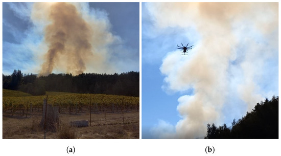 (a) Smoke plume emitted from a prescribed fire at Jack London State Park. (b) UAV-based data collection during a prescribed fire at Jack London State Park.