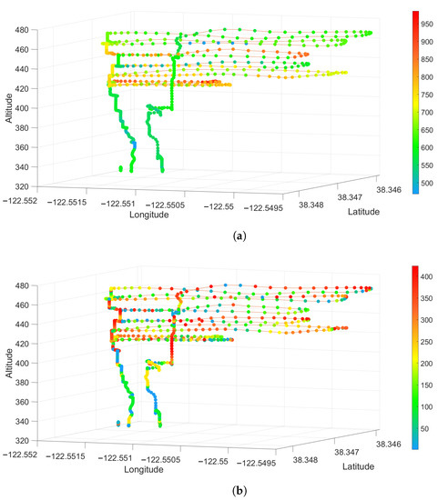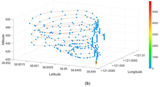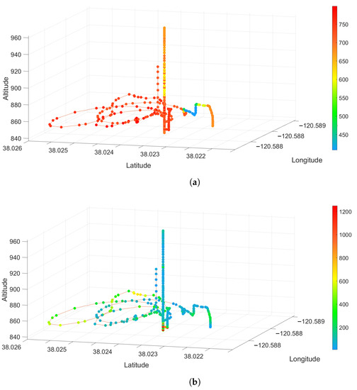 Figure 10, Figure 11 and Figure 12 show 3-D scatter plots that were generated by synchronizing the UAV’s 3D GPS data (Latitude, Longitude, and Altitude) with the sensor package’s CO and PM2.5 data from each of the prescribed fire experiments. For each of these plots, the spectrum ranges from 0 (blue) to the highest value detected for each individual experiment (red). The CO data are given in ppm and the PM2.5 data represents the number of particles detected.