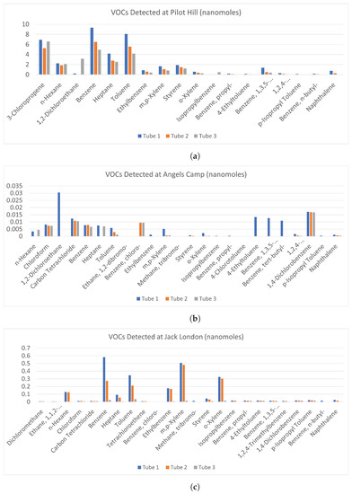 Figure 13a shows the samples taken at Pilot Hill. Tubes 1, 2, and 3 were sampled at the same location but at different times starting from tube 1 and increasing in 7 min intervals. With each sample, the smoke plume became less dense and the corresponding lower concentrations of the VOCs can be observed.