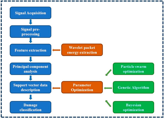 In engineering, most structures are healthy, and data on damaged structures are often difficult to obtain. There are two prominent cases of acquired data: the first is that the acquired database contains mostly healthy structural data and a small percentage of damaged data. The second is that the acquired database contains data on all healthy structures. The traditional support vector machine needs to be improved for damage identification of MBEJs because it requires sufficient data on health and damage. SVDD is a single classification algorithm that can build a database with health data. This paper uses SVDD to perform the study analysis. Figure 1 shows the flowchart of the proposed method. The initial step is to collect and process the sound signal. Then, the wave packet energy ratio of the processed signal is calculated and used as a feature vector. The wave packet energy can reflect the signal’s energy percentage in different frequency bands. Next, the dimensionality of feature vectors is reduced using principal component analysis, which is used to compute the SVDD model. In the training of SVDD, the selection of key parameters is essential. This paper uses three parameter optimization methods to select the best parameters for SVDD. Finally, three methods of SVDD parameter optimization are selected for comparison. Section 2.1 discusses the method of feature extraction (wavelet packet transform); Section 2.2 discusses three methods of parameter optimization; and Section 2.3 reviews the methods of SVDD.