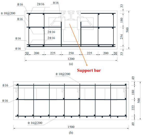 Details of the reinforcement of the specimen: (a) front view of the specimen; (b) side view of the specimen.