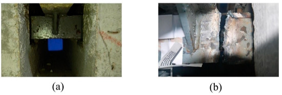 Due to the speed and safety of oxygen-cutting technology, the support bar of specimen 1 was cut using oxygen-cutting technology to simulate the actual fracture. In order to acquire the sound signal under the impact action, the specimen was excited by a hammer. The hammer excitation method was used to simulate the impact of vehicles on the MBEJ. Since the damaged part is located in the support bar, the sound generated by exciting the center beam in the upper part of the support bar is more representative of the characteristics of the support bar. Therefore, the excitation position was the center beam in the upper part of the support bar. A PM461 microphone, produced by Shenzhen Moro Zhiyuan Technology Company, was used to collect the sound signal of the hammer impact with a sampling frequency of 20 kHz. In order to ensure the signal integrity and the quietness of the test site, the experimental time was chosen to be at night. Therefore, the experiments do not consider noise. During the test, two 50 mm thick foam pads were placed at the bottom of the specimen to reduce the disturbance of the ground. Finally, all of the signals collected for health came from specimen 2. The damaged signals came from specimen 1, in which the support bar was broken. Figure 4 shows the two specimens of the experiment. Figure 5 shows the healthy and damaged support bars.