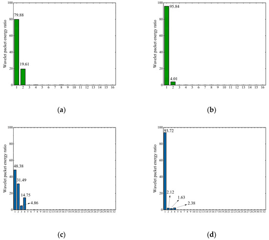 A representative set of data was extracted from several hundred sets of data, and each set had the same characteristics. Figure 7 shows the results of this dataset’s four-layer and five-layer wavelet packet decomposition, including healthy and damaged states. Figure 7a,b shows that the frequency band division of the four-layer wavelet packet decomposition is not apparent. Before and after the damage changes, the wavelet packet energy ratio is less in numerical value, with the first frequency band increasing by only 15.96. The energy ratio of the five-layer wavelet packet decomposition changes significantly in numerical value before and after damage. The energy ratio increase in the first frequency band is 45.34. The energy ratio of the second, third, and fourth frequency bands is reduced to about two following damage. The five-layer wavelet packet decomposition is better than the four-layer, which responds to a significant change in damage. Therefore, this paper selected five-layer wavelet packet decomposition to extract the feature vectors. Figure 7c,d shows the results of the five-layer wavelet packet energy ratio.