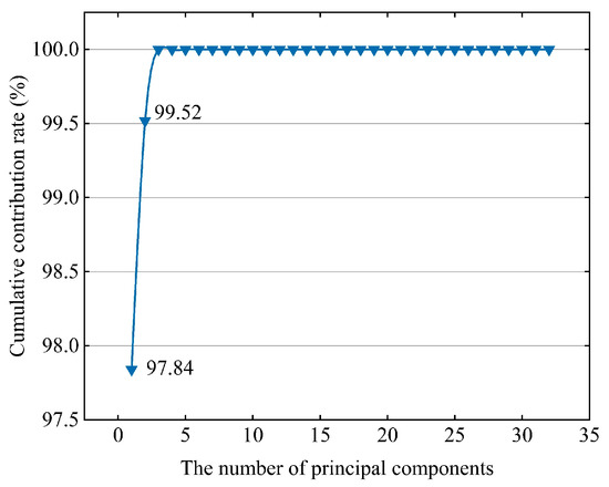 Figure 8 illustrates the results of the cumulative contribution rate (CCR) using the PCA. The CCR increased from 97.84% to 99.52% when the number of principal components was increased from one to two. Subsequently, the CCR curve gradually flattens, and the amount of information contained in the principal components decreases. When the number of principal components was increased from 2 to 32, the CCR increased by only 0.48%. Therefore, the first two dimensions of the principal component analysis were used for SVDD to improve the computational efficiency.