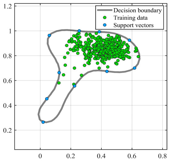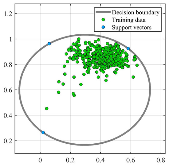 In the damage monitoring of bridge expansion joints, the amount of healthy and damaged data needs to be more balanced, and damaged data are challenging to obtain. Therefore, monitoring expansion joints is a single-classification problem. Support vector data description (SVDD) is a single classification method that aims to find the smallest possible hypersurface to enclose more of the target data [41,42,43]. It is suitable for the damage monitoring of support bars.