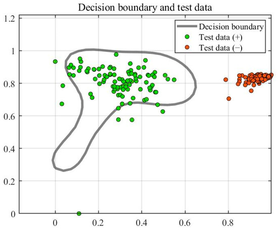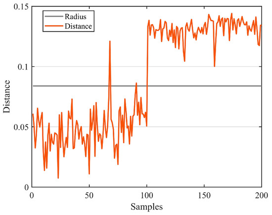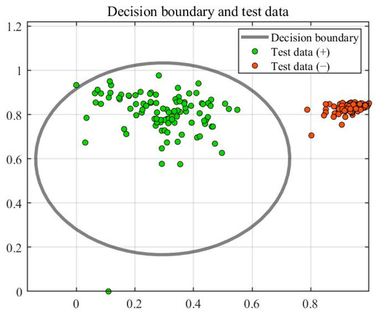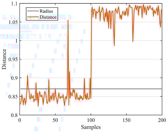 Figure 9 shows the training results of SVDD. Training created ten support vectors, which created a decision boundary. The accuracy rate of the test was 95%. Figure 10 shows the test results of the test set, where the green point is the positive sample and the orange point is the negative sample. The horizontal line in Figure 11 represents the radius of the hypersphere obtained by training the positive sample. The radius R of the hypersphere obtained was 0.8704. The test results conclude that SVDD divides the negative samples clearly, but identifying the positive samples requires more accuracy. Most of the positive samples were within the hypersphere radius and a few of the positive samples were outside the hypersphere radius R. There are two main reasons for this. The first reason is that the density distribution of the support vectors used for training is not uniform, resulting in less than reasonable training of the decision boundary. The second reason is that the penalty and kernel parameters are not suitable for the SVDD model. Therefore, parameter optimization with a suitable algorithm is required.